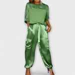 Puhaságáról és légáteresztő tulajdonságáról ismert selyemből készült, ez a szett eleganciát és sokoldalúságot ötvöz, így ideális mindennapi viseletként vagy esti programokhoz is. A félhosszú ujjú felső kifinomultságot sugároz, míg a laza szabású nadrág maximális kényelmet és mozgásszabadságot biztosít.