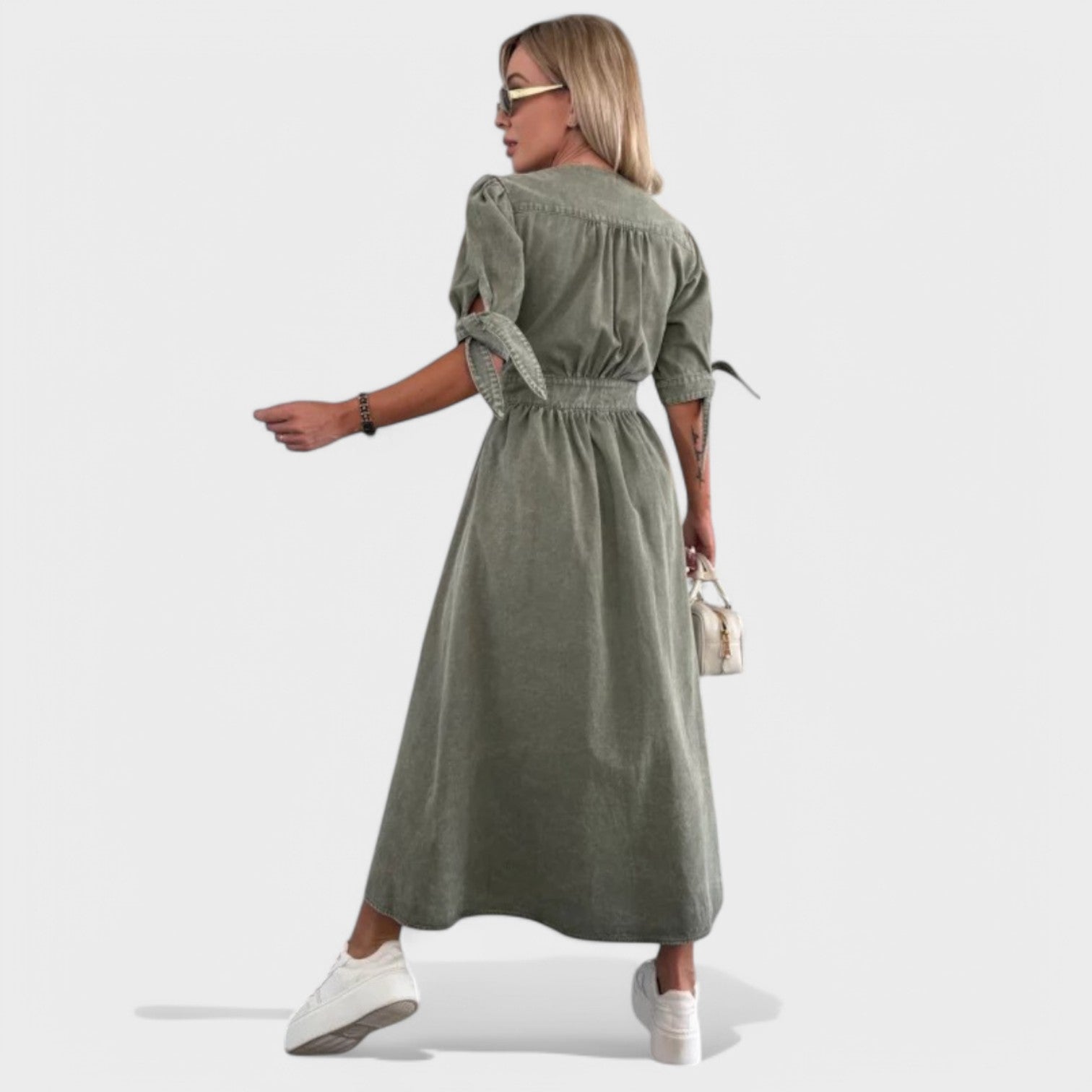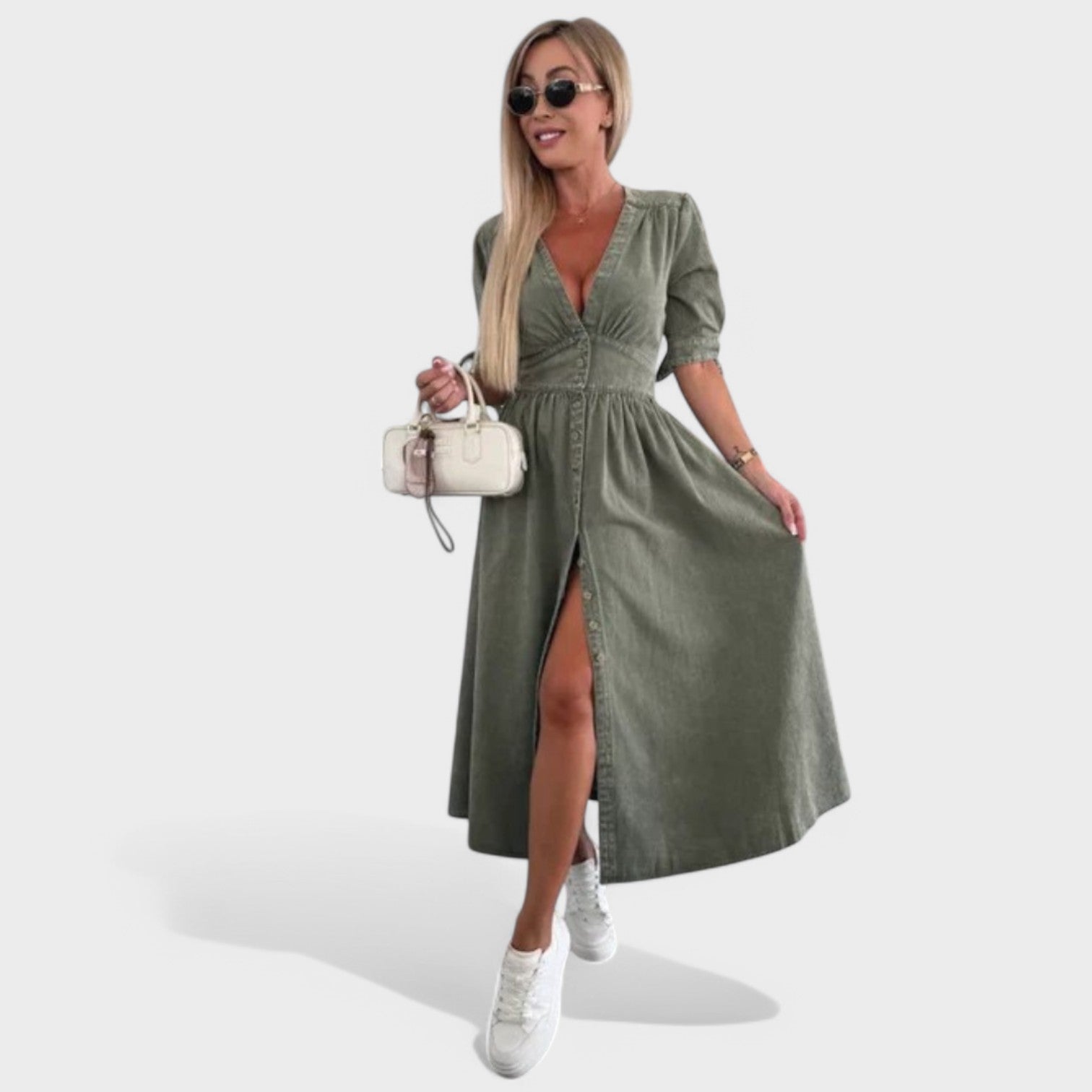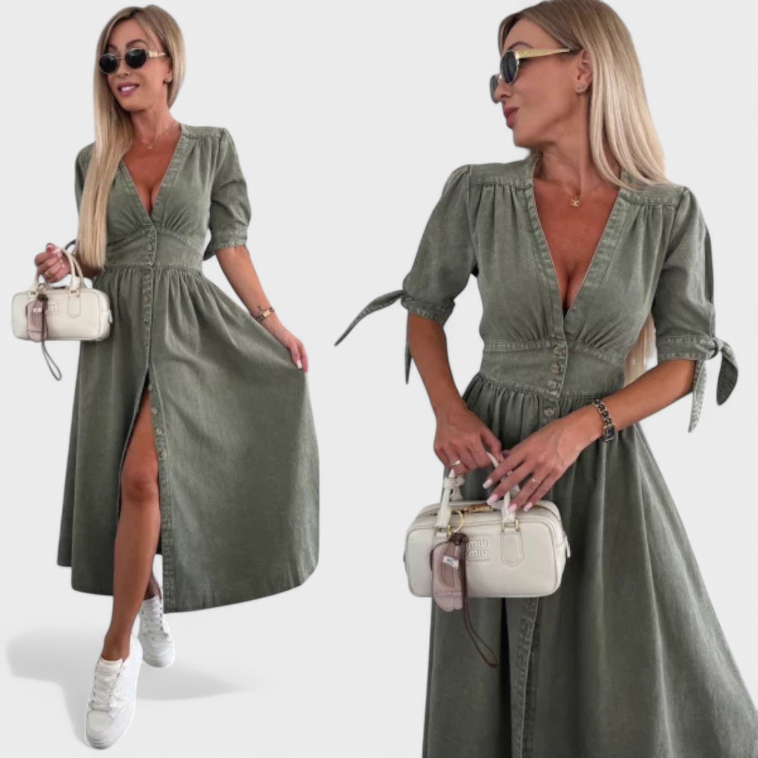 • Sokoldalúság – Az olívazöld szín és a farmer hatású anyag könnyen kombinálhatóvá teszi ezt a ruhát. Hordhatod sportcipővel a laza hétköznapokra, vagy magassarkúval elegánsabb alkalmakra.
