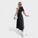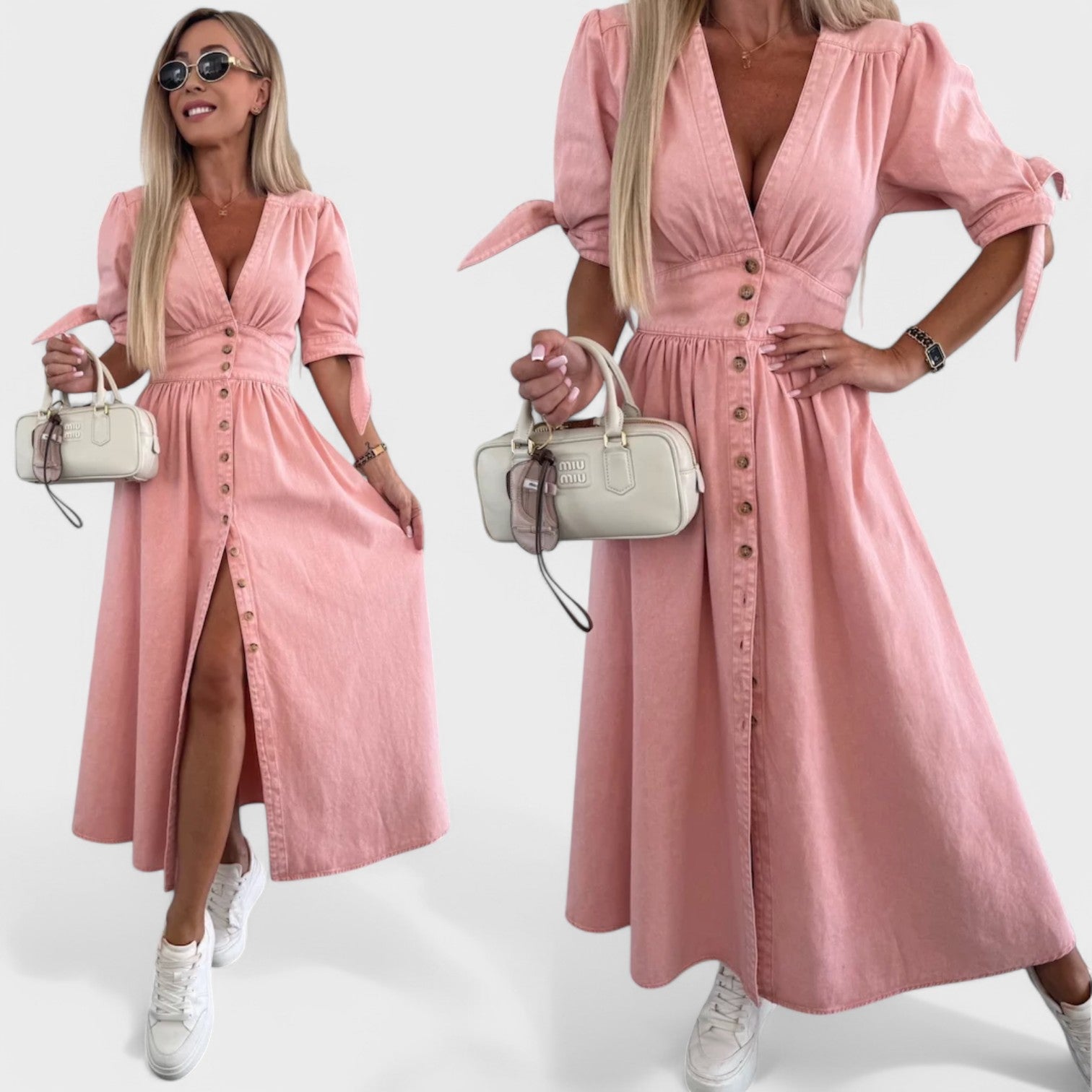 • Előnyös fazon – A V-nyakkivágás, a karcsúsított derékrész és a sliccelt szoknya optikailag nyújtják az alakot, kiemelik a sziluettet anélkül, hogy túl szoros lenne.