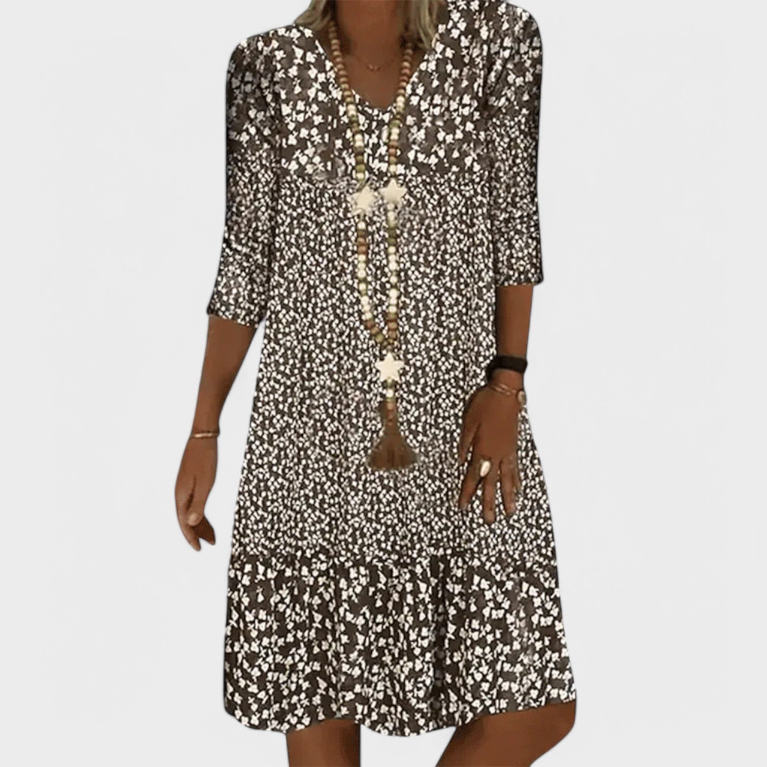• Elbűvölő részletek – A finom virágminták keveréke és a V-nyakkivágás természetesen emelik ki a sziluettet. Ezen kívül az olyan részletek, mint a fodros alsó szegély és a kézműves nyaklánc (opcionális kiegészítőként) különösen bájos boho-chic hatást kölcsönöznek.
